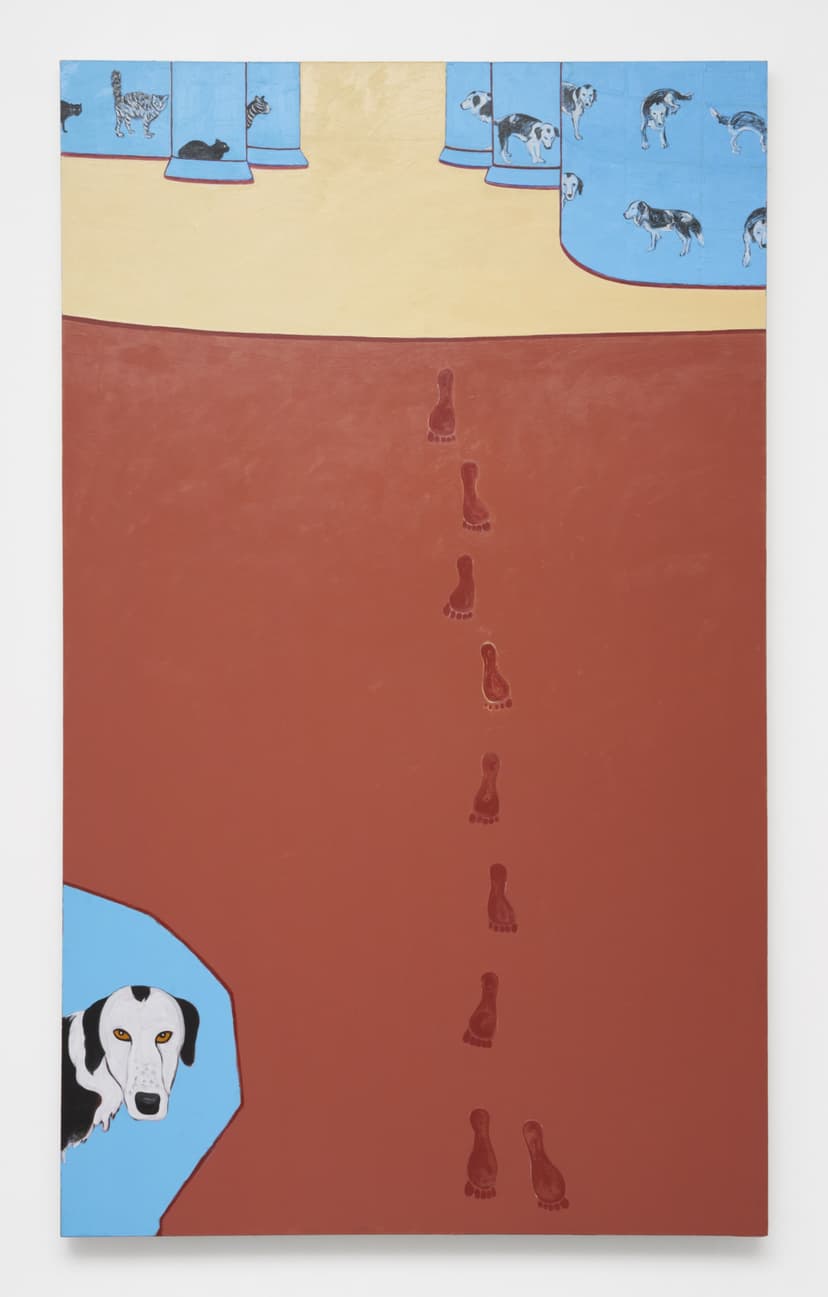 Joan Brown: The Golden Age presents fourteen paintings and sculptures from 1981 to 1988, centering on the vibrant late work made in the decade before Brown's untimely death at fifty-two. Inspired in part by Henri Rousseau, the works feature flattened compositions and graphic directness, with unlikely animal companions — lion and lamb, peacock and snake, cat and rat — coexisting in peaceful harmony. Images drawn from disparate cultures and history are collaged together, including a self-portrait of Brown standing inside the mouth of an ancient Egyptian bolti fish, symbol of regeneration. Art, for Brown, was a mirror for her current state of being and a vehicle for awe.
