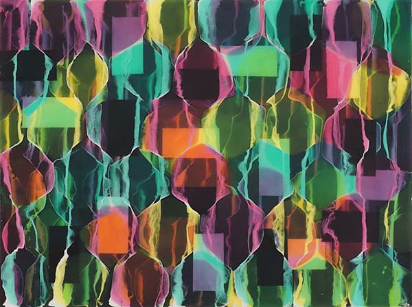 Maureen McQuillan: Colaratura presents process-driven paintings exploring color, line, and movement. Black wood panels are layered with white lines and transparent inks, forming web-like networks of ovals and patterns. Tonalities range from subtle to vivid, with kaleidoscopic, pulsating effects evoking organic forms and optical vibrations. Geometric elements disrupt and emphasize space, creating dynamic, immersive compositions that reflect hope, joy, and connection.