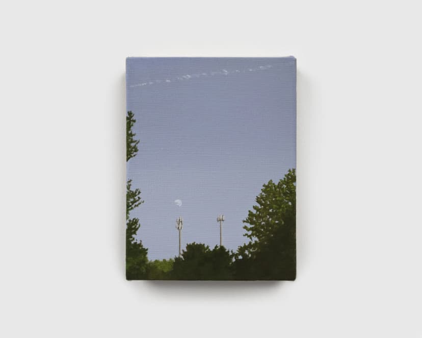 Dana Powell’s Rest Stop presents a quiet roadside scene lit by headlights fading into darkness, evoking memory and absence. Her detailed oil paintings depict deserted yet familiar places—highways, wires, moonlit skies—tracing the remnants of human presence. Skewed perspectives and subtle light create a dreamlike tension between nostalgia and uncertainty. Her work captures fleeting moments of wonder amid the fractured stillness of modern life.