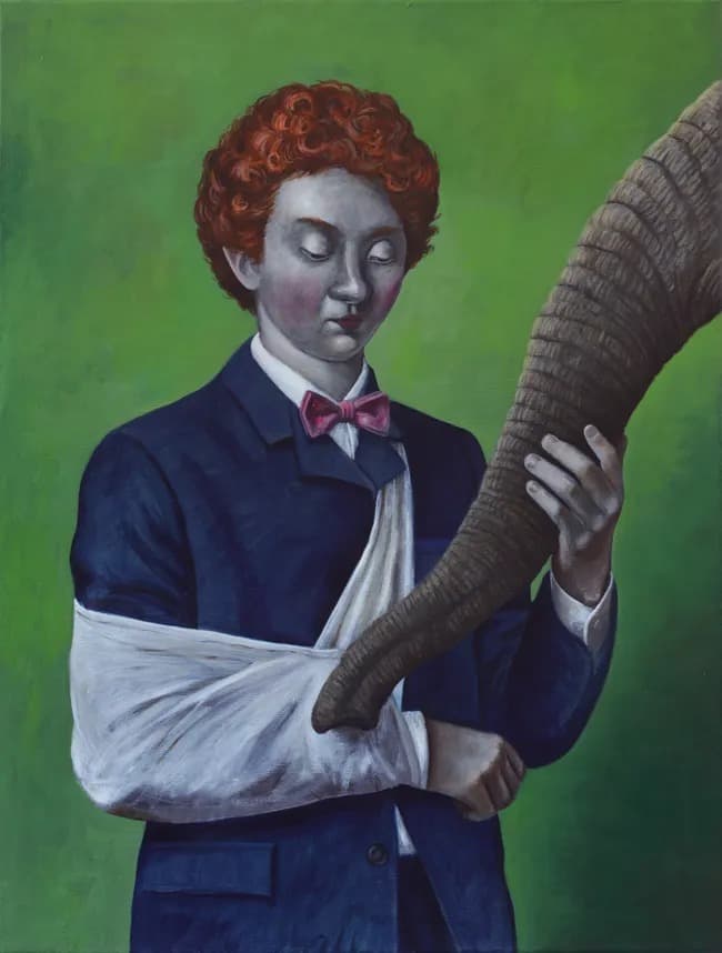 Paul Pretzer: The Way You Make Me Feel presents a new body of work that distills Pretzer's sustained investigation into the mechanics of image-making. Pared-down scenes hold moments in suspension — a figure cradling an elephant's trunk with ceremonial care, an embrace with subtle misalignment, a still life collapsing romantic symbolism with theatrical excess. Pale, red-haired figures recur as a condition of perception rather than narrative, rooted in Pre-Raphaelite lineage yet absorbed into personal mythology. Emotion is not expressed but staged: assembled through gesture, color, and relation, then deliberately withheld from resolution.