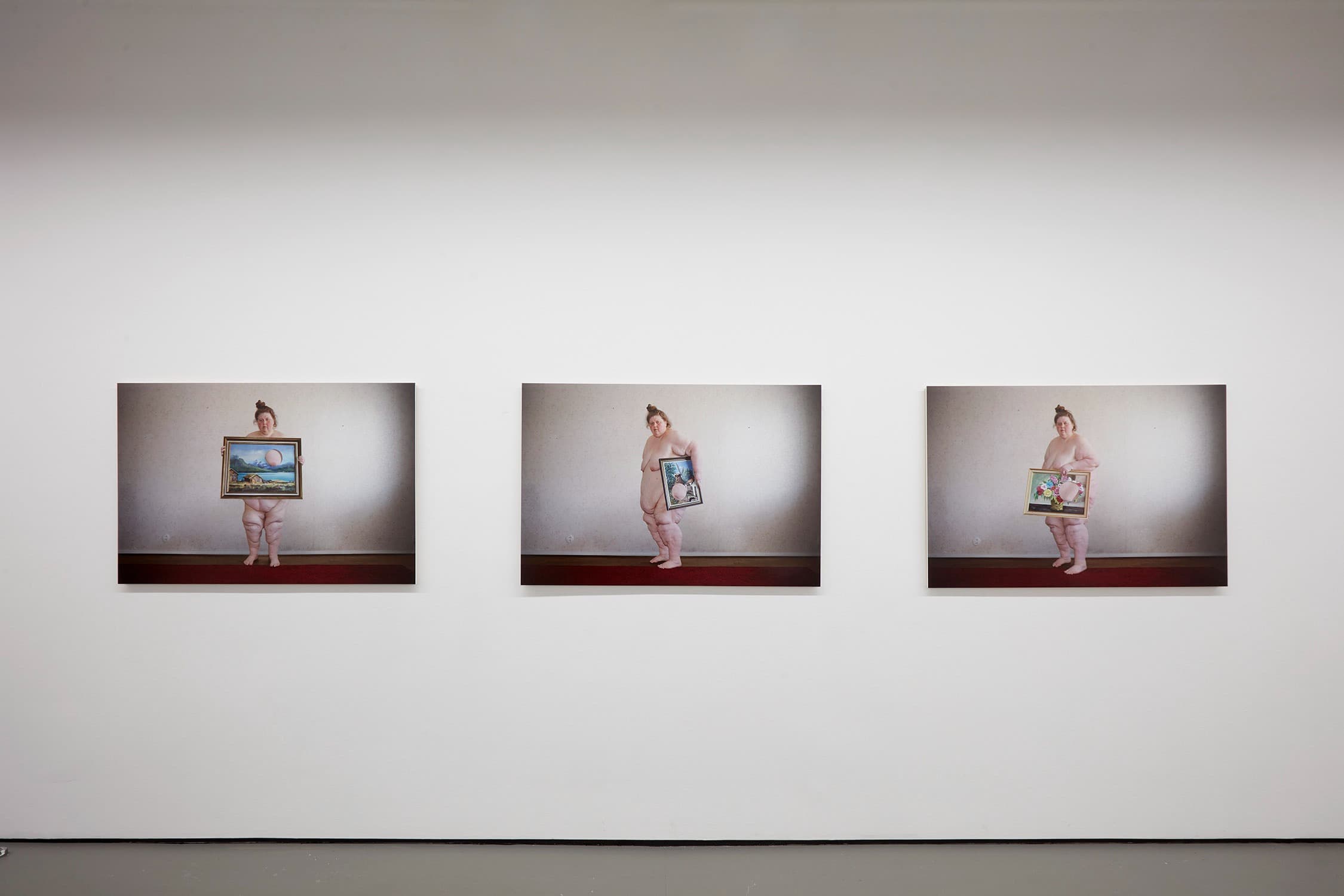 Touchdown by Venus is a solo exhibition by Iiu Susiraja. The exhibition presents self-portraits staged by the artist in domestic interiors, using everyday objects as props. Centered on her full body, the works examine scale, physical presence, and gesture through humor and discomfort, positioning the body in direct relation to familiar household spaces.