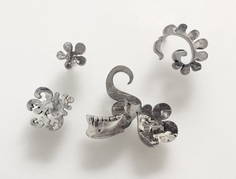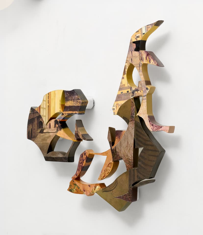 In Unreliable Narrators, Rochelle Voyles explores the cyclical nature of humanity’s patterns and the underlying impulses that drive behavior. Mining historical textile diagrams and vintage magazines, Voyles arranges fragments of different moments and settings, people, objects, and places meticulously in collage on-wood cut sculpture. Layering and abstracting time, the work reveals and challenges the social narratives embedded in found images, exposing how history and collective memory are constructed and repeated.