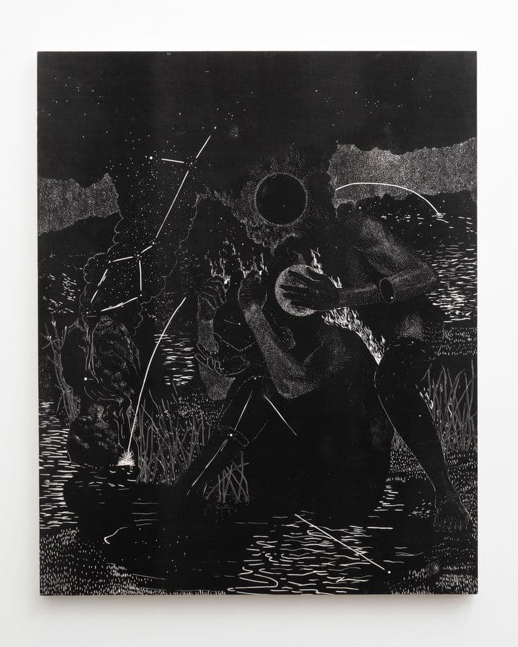 Sargent's Daughters is pleased to present Voids and thresholds, a solo presentation of new works by a Mexican-born, Atlanta-based artist Sergio Suarez. In a practice that encompasses woodblock carvings and prints, paintings, drawings, and sculptures, Suarez creates resonant allegories of metaphysical forces. Drawing equally upon Indigenous cosmologies and contemporary astrophysics, his work reframes concepts of temporality, translation, and syncretism.