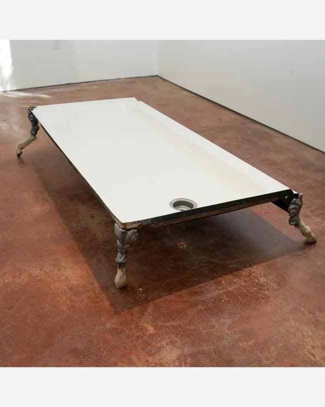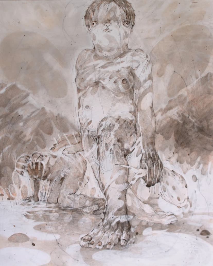 “Waters of Pure Reason” brings together works by Katya Labowe-Stoll and Marley White. Labowe-Stoll paints humanoid figures that merge with their surroundings, forming shifting, composite bodies. White creates objects using metal, pearl, and animal materials that link bodily form to the earth, emphasizing shared materiality.
