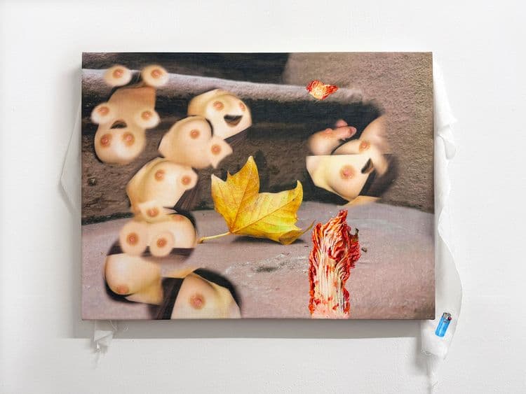 Kai Oh’s Unpleasant Episodes dissects the cultural contradictions surrounding women’s bodies by fragmenting and reassembling forms, particularly breasts and nipples. Through digital collage and material experimentation with silk and soil, she highlights the tension between visibility and regulation. Her work reclaims pejorative imagery, critiquing gendered expectations while transforming familiar symbols into absurd, irreverent compositions that resist easy interpretation or objectification.